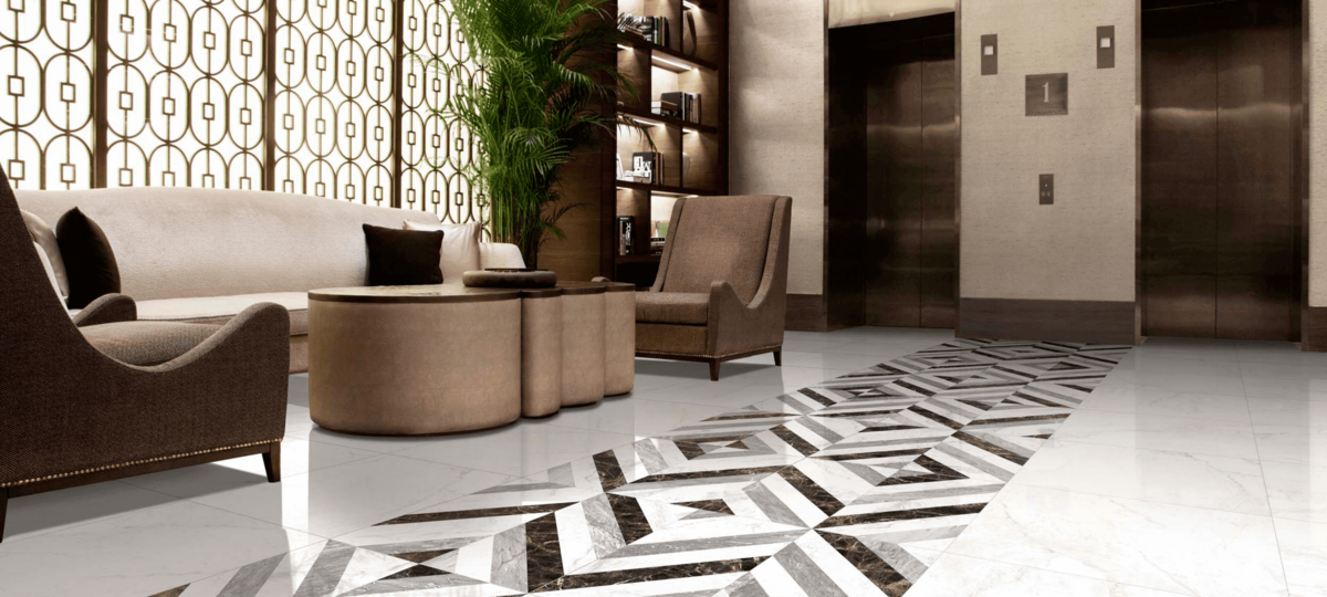- В бизнес-центрах и государственных учреждениях акцент делается на поддержании делового настроения, что достигается с помощью сочетания плитки светлых и черных тонов со строгим геометрическим рисунком.