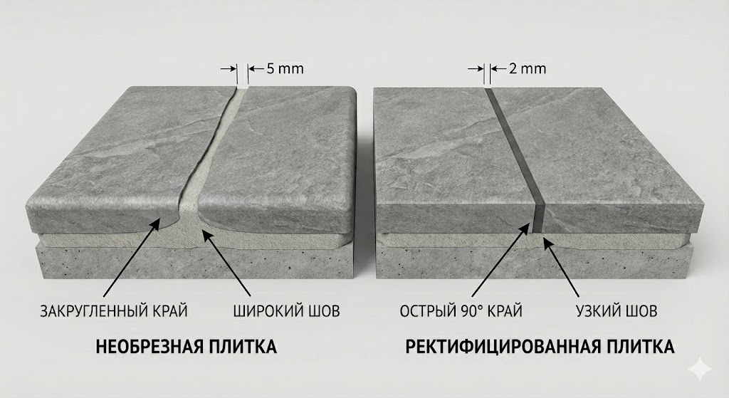 Очень просто. Посмотрите на торец плитки. У ректификата он будет матовым, острым и идеально ровным, как будто его только что отпилили. Ищите на упаковке маркировку: Rettificato, Rectificado или Rectified. У обычной плитки край будет скругленным, часто покрытым глазурью с небольшим наплывом.